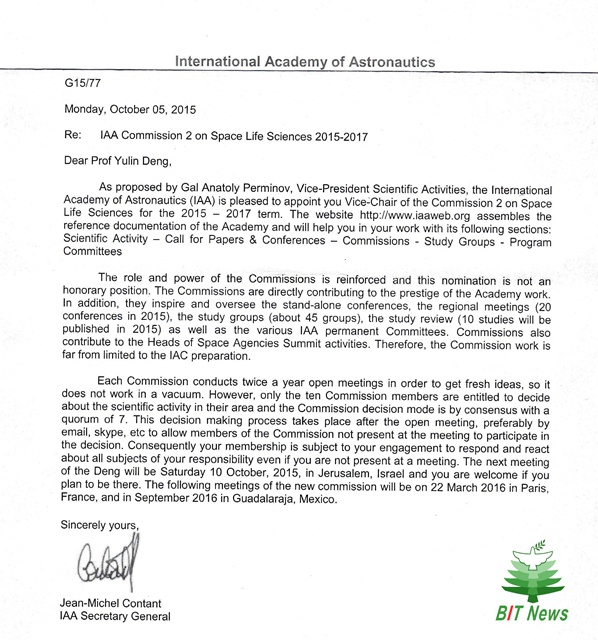 邓玉林教授长期立足于空间生命科学研究,于2013年9月当选为国际宇航科学院通讯院士。国际宇航科学院依据院士增选规则,在2015年6月决定增选邓玉林教授为国际宇航科学院院士。2015年10月初国际宇航科学院又任命邓玉林教授为其学术委员会副主席,在任免通知中希望邓玉林教授作为首位中国籍副主席,能够积极参与到国际宇航科学院在全球范围内的20个学术会议、45个研究小组和10个出版物的组织和领导工作之中,为世界航天科技的发展做出贡献。