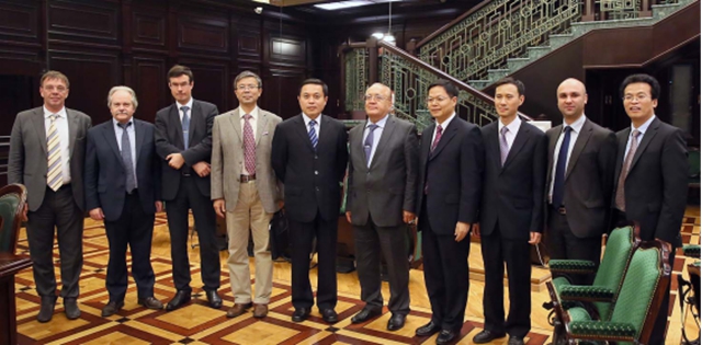 Sadovnichy 校长(右5)欢迎胡校长(左5)、赵平副校长(左4)一行