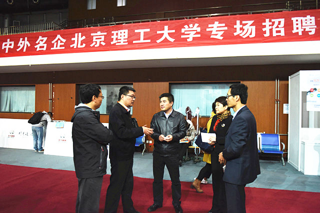 北京市毕业生就业服务中心主任陈永强、副主任宋双印,北京市外企人力资源服务有限公司纪委书记纪海霞与我校招生就业工作处处长李振键、副处长林骥佳在招聘会现场。