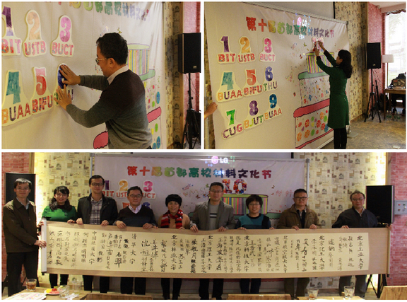 文艺表演之后,八校师生共同完成了闭幕式艺术作品。参加闭幕式的各高校同学们完成了代表首都高校材料文化节十周岁的生日蛋糕,八校嘉宾将代表主办届别和学校的贴纸贴入作品中,共同表达了美好的祝愿,希望首都高校材料事业像七彩蛋糕一样绚烂多彩。