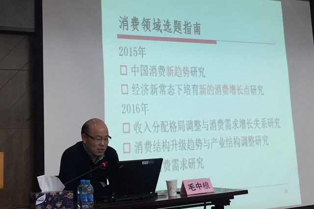 毛中根结合自己在国家社会科学基金的申报组织与管理,以及自己主持重大项目、青年项目的经验,对国家社科基金的申报进行了系统深入地讲解。他首先向大家概括介绍了国家社科基金的项目类别以及全国哲学社会科学规划办公室的机构设置和机构职能。之后,他从选题、课题论证、研究基础和条件保障等方面详细介绍了申报的各类注意事项。他强调,在选题方面要有政治意识、问题意识、目的意识、定位意识和设计意识。在论证方面要注意多角度思考的原则性、撰写申请书的关键点以及“课题论证”的基本要求。在研究基础和条件保障方面,要注意组织研究团队的方法。最后,他分享了自己成功申报国家社科基金重大项目、青年项目时在选题、定位、课题设计和逻辑构架方面的心得。报告结束后,毛中根与大家就一些重要问题进行了热烈探讨,解决了老师们的疑问。