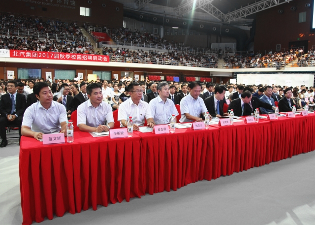 招聘开始前,北汽集团举行了2017届秋季校园招聘启动仪式。北汽集团党委副书记韩永贵,党委常委、组织部部长兼人力资源管理部部长高原,副总经理蔡速平,人力资源管理部部长助理胡雪涛以及北汽集团下属企业的负责人专程来到我校参加了此次活动。副校长王晓锋,纪委书记杨志宏,校长助理郝志强,招生就业工作处处长李振键,机械与车辆学院副书记、副院长范文辉等出席了启动仪式。