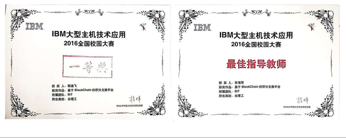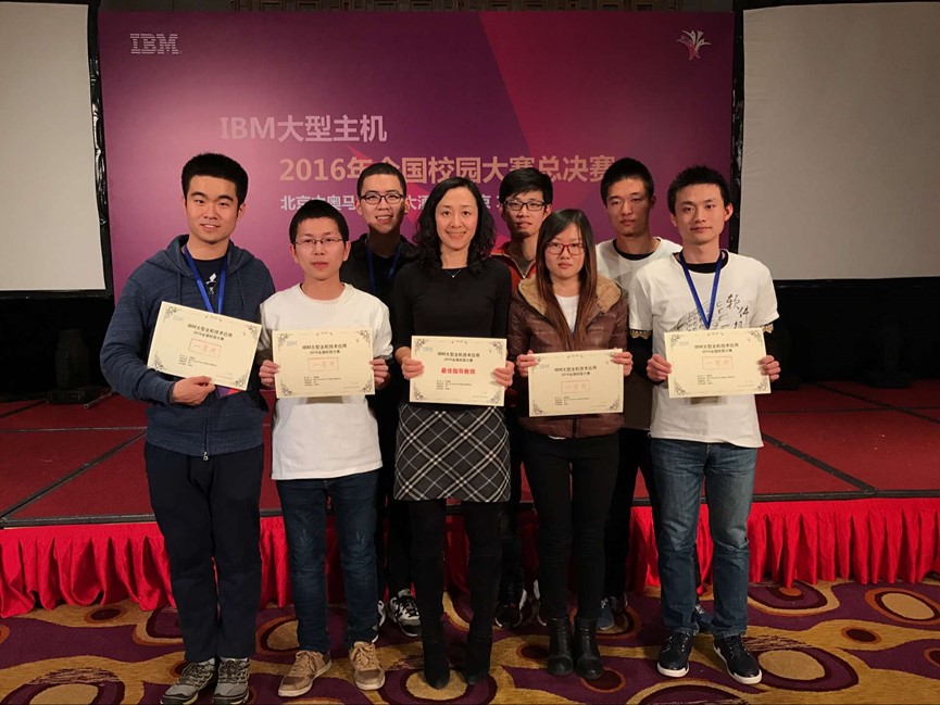 2016年12月8日,IBM大型主机技术应用2016全国校园大赛决赛在北京中奥马哥孛罗大酒店圆满落幕。金年会jinnianhuicom软件学院车海莺老师带领的7名研究生、本科生组成的团队研发的“基于区块链的积分交易平台”作品,经过预赛环节多名专家长达一个多月的严格评审,进入全国总决赛,决赛期间经过“现场展示”和“自由发挥”两个环节的激烈角逐,不负众望,凭借深厚的主机应用能力和行业领先的区块链技术获得各评委专家的高度评价,最终荣获了本次大赛的团队赛冠军,团队指导教师车海莺老师获得最佳指导教师奖。