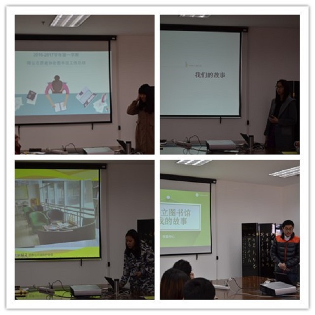 来自微尘志愿者协会的杨珏莹、绿风志愿者协会的郄天琪、绿萌资源与环境保护协会的栾英婷、学生会权益中心的孙文景同学,分别对各自社团一年来参加图书馆的志愿工作进行了总结,并提出下一年的工作目标。