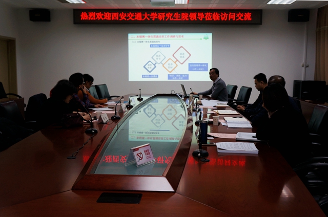 西交大龙建纲介绍了此次来访的目的和调研内容,我校王军政简要介绍了研究生院基本情况,重点介绍了我校本硕博一体化贯通培养方面的工作。