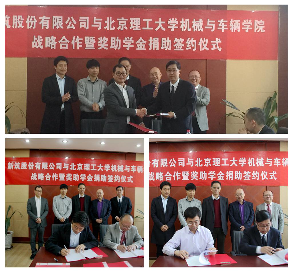 会上,北理工机械学院与成都新筑股份公司签署了战略合作框架协议和新筑奖助学金合作协议。双方表示,希望通过此次合作,以新筑路桥在新能源汽车领域的产业化能力为依托,以北理工在新能汽车领域的先进技术为支撑,推动双方在科学研究、人才培养、产学研基地建设等多领域的深度合作,促进双方共同发展。