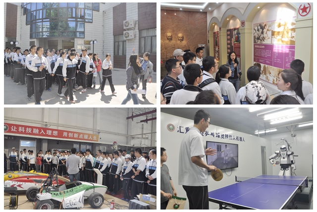 欢迎仪式结束后,来访师生分成三组相继参观校史馆、车辆学院学生创新创业实践中心、机电学院智能机器人研究所等地。在校史馆,讲解人员通过一幅幅老照片,耐心细致地为大家讲述北理工的发展历程;在车辆学院学生创新创业实践中心,车队负责人为大家展示了节能竞技赛车、大学生方程式赛车等自主研制车型以及车队在国内外比赛中所取得的荣誉,并就同学们提出的问题进行解答;在机电学院智能机器人研究所,大家参观了新型的主要用于医疗手术的微小型机器人实验室,并与“汇童”系列仿人机器人进行了乒乓球比赛等互动活动,获得了在场师生的一致好评。