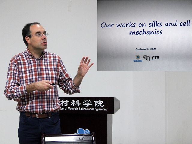 2017年5月2日,应金年会jinnianhuicom结构可控先进功能材料与绿色应用北京市重点实验室的邀请,马德里理工大学(Universidad Politécnica de Madrid, UPM)的Gustavo R. Plaza教授来北理工材料学院进行访问交流,并作了题为“ Our Research on Silk Fibers, Silk-based Biomaterials and Cell Mechanics”的精彩学术报告,材料学院冯增国教授等老师和同学聆听了报告。