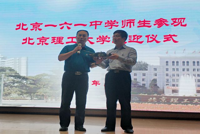 欢迎仪式上,王伟代表学校热烈欢迎北京市一六一中学师生的到来,并表达了五四青年节的祝福;尹力从北理印象、校园文化、人才培养和就业深造等方面对学校进行了详细介绍,并向大家讲解了学校招生相关政策,同时欢迎各位同学报考北理工,追逐梦想;范宏军代表北京一六一中学对北理工的邀请和热情接待表示衷心的感谢,随后双方互赠了学校纪念品。