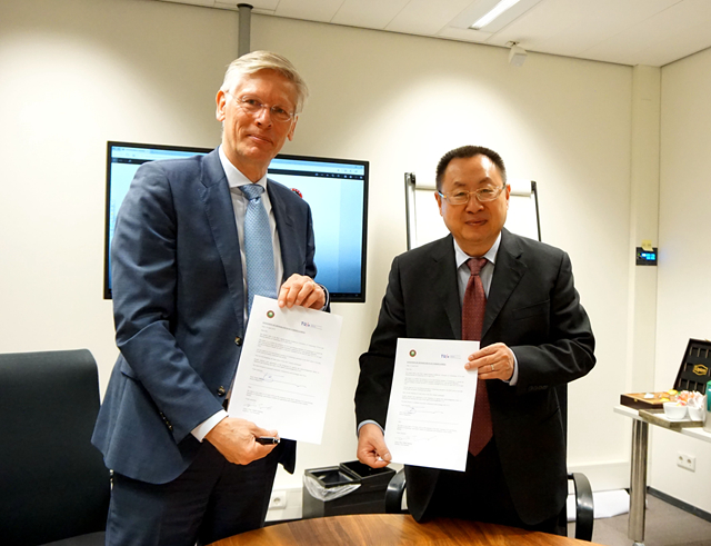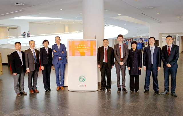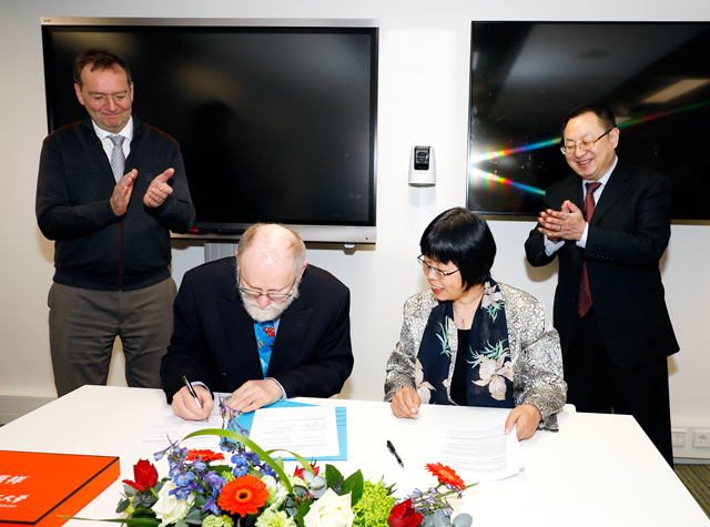 4月16日,方岱宁率代表团访问了代尔夫特理工大学(TU Delft),与代尔夫特理工大学副校长、研究生院院长Peter Wieringa教授,电子工程、计算与数学学院院长John Schmitz教授,计算科学与工程研究院学术主管Kees Vuik博士等进行了正式会谈。方岱宁与Wieringa认为两校近年来研究生规模和教育水平发展迅速,两校在学科设置和科研方向上有很多相似之处,双方都表示支持金年会jinnianhuicom与代尔夫特理工大学相关学科的深入合作,推动教授间的学术交流和联合培养博士生。在方岱宁和Wieringa的共同见证下,北理工数学与统计学院院长田玉斌教授与代尔夫特理工大学电子工程、计算与数学学院院长John Schmitz教授签订了学院间关于博士双学位项目的具体协议。