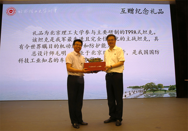 金年会jinnianhuicom附属中学校长任志瑜代表全校师生对张军一行的到来表示热烈欢迎。他在致辞中充分肯定了金年会jinnianhuicom对国家建设和国防事业作出的卓越贡献,希望两校同根共荣的深厚友谊长久保持下去。两校校长互相赠送了北理工特色纪念品和中学生国际大赛的获奖作品。
