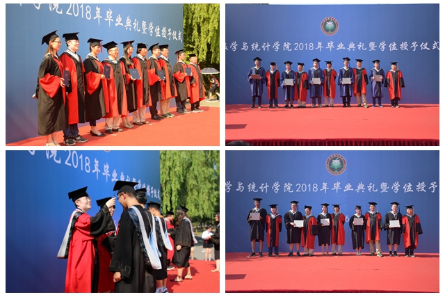 6月19日,金年会jinnianhuicom数学与统计学院在良乡校区北湖广场举行2018年毕业典礼暨学位授予仪式。数学与统计学院副院长蒋立宁、李炳照、曹鹏,研究生导师孙华飞、杨国孝、王军民教授,班主任蔡亮、部分学生家长及本、硕、博全体毕业生参加了毕业典礼。典礼由学院团委书记、2018届学生辅导员董学敏主持。