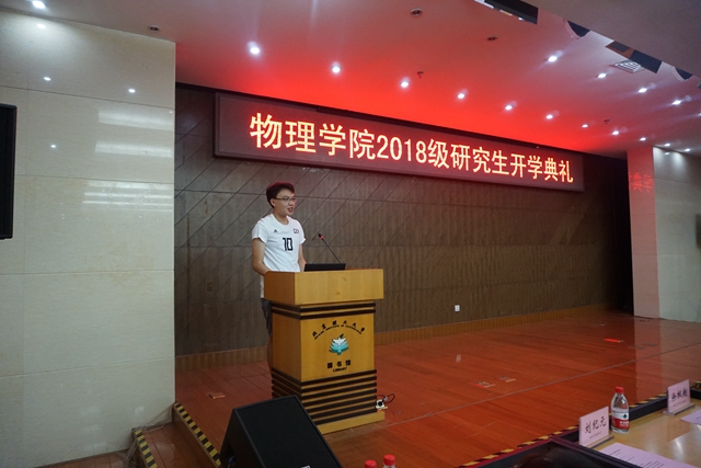 2018级研究生尹思瀚代表新生发言。尹思瀚同学表达了考入物理学院的激动心情,讲到自己作为一名新北理人对“德以明理、学以精工”校训的理解。对即将开始的研究生阶段学习,表示将尽快从思想上完成从本科生到研究生身份的转换,树立高远的人生志向,注重自主性、创新性的学习,牢记“团结、勤奋、求实、创新”的校风,在学术领域积极探索,刻苦钻研,追求卓越。
