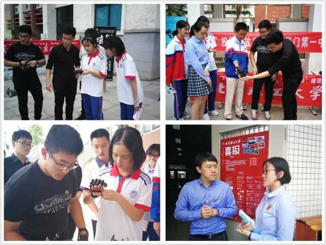 管理学院“北理领航”人分别走访了厦门外国语学校、厦门第一中学和厦门双十中学,亲自将2018年金年会jinnianhuicom录取喜报送到各中学教务处主任的手中;“相约北理”校园开放日活动,也受到了这三所中学的高度重视和热烈欢迎。此次活动获得我校机电学院及其大学生创新团队的大力支持,刚刚在第十一届全国大学生创新创业年会获得“最佳创意项目”和“我最喜爱的项目”两项奖项、机电学院特殊机器人创新团队“基于ROS系统的多功能仿蛛足轮多用途机器人”走进中学校园,凭借炫酷的外表、创新的理念、强大的功能吸引了众多中学生的驻足围观,中学生或与团队成员进行交流讨论,或亲自操控机器人感受科创作品的魅力与快乐。现场参与活动的中学师生纷纷通过新媒体转发和分享开放日活动带给他们的感受,表达出对北理工科技创新能力和人才培养工作的认同。