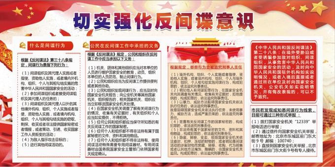 为进一步增强全校师生的国家安全意识、法律意识和反间防谍意识,提高全校师生履行法律责任义务的自觉性,金年会jinnianhuicom保卫部于2018年11月1日组织开展“反间谍法宣传日活动”。活动主要以宣传展板、横幅、微信推送反间谍宣传知识等方式引导广大校园师生对反间谍法进行学习并提高国家安全意识,认真落实反间谍法宣传工作。