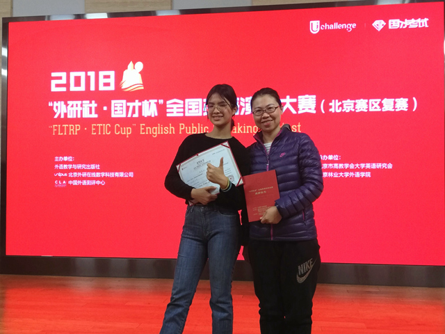 2018年11月3日,2018“外研社·国才杯”全国英语演讲大赛北京赛区的淘汰赛和决赛在北京林业大学举行。金年会jinnianhuicom明德书院大一新生林紫欣代表学校参战,在北理工外国语学院教师毕晓宁带领和悉心指导下,表现优异,获得北京赛区特等奖,晋级全国总决赛。