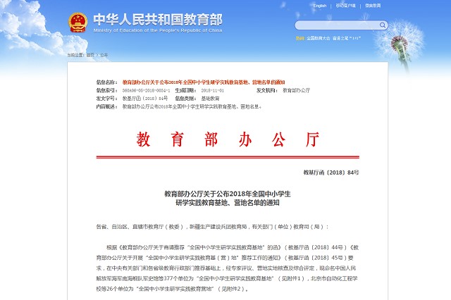 北理工光电创新教育实验基地入选教育部“全国中小学生研学实践教育基地”