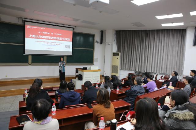 顾晓英研究员作了题为“从‘大国方略’到‘人工智能’——上海大学课程思政的探索与成效”的报告。她首先介绍了所领衔的、从“大国方略”到“人工智能”系列通识课程的新思路、新做法,秉承“立德树人”的教育理念,采用思政课教师串联教学活动,专业课教师主讲教学内容的“项链模式”进行教学。她还介绍了上海大学以“课程思政”为目标进行的课堂教学改革,通过优化课程设置,修订专业教材,完善教学设计,加强教学管理,梳理各门专业课程所蕴含的思想政治教育元素和所承载的思想政治教育功能,融入课堂教学各环节,实现思想政治教育与知识体系教育的有机统一。报告结束后,与会教师和顾晓英研究员热烈探讨“课程思政”中的问题。