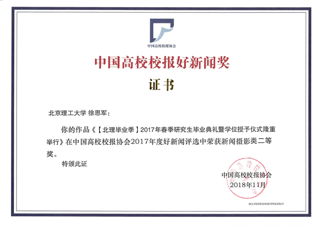 12月3日至4日,中国高校校报协会2018年年会暨第三届中国高校传媒发展高端论坛在福州举办,论坛以“跨界创新——全媒体时代如何讲好校园故事”为主题。论坛上揭晓了2017年度“中国高校校报好新闻”评选结果,我校校报荣获佳绩。其中,《微信“地球变脸”,北理工技术助力中国气象卫星明辨“风起云涌”!》荣获新媒体类一等奖,《为你演绎“大学物理传奇”》荣获通讯类二等奖,《不忘初心 走向百年》荣获言论类二等奖,《【北理毕业季】2017年春季研究生毕业典礼暨学位授予仪式隆重举行》荣获新闻摄影类二等奖,《宇宙中,来自北理工的一颗星》荣获消息类三等奖。