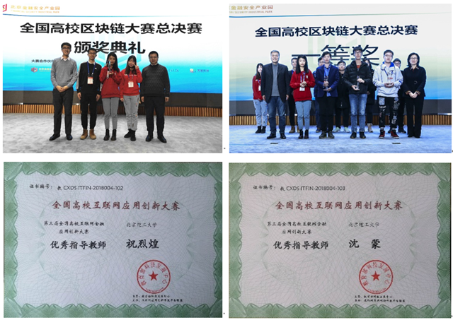 2018年12月8日,第三届全国高校互联网金融应用创新大赛——基于区块链的互联网创新应用总决赛在北京互联网金融安全示范产业园成功落下帷幕。经过来自六大赛区一等奖的20支队伍的精彩角逐,由北理工计算机学院副院长祝烈煌教授、沈蒙副教授指导的参赛队伍“837-offline”队伍(包括:唐湘云,2016级博士;尹昊,2018级博士;史可新,2017级硕士)获得“基于区块链的互联网创新应用大赛”全国一等奖(奖金5万元),两位指导教师荣获大赛优秀指导教师奖。同时,金年会jinnianhuicom计算机学院获得大赛优秀组织奖。