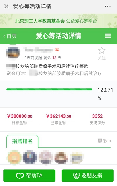 2019年3月15日,一位女博士牵动了数千北理工人的心,在北理工的“爱心筹”平台上,一场爱心接力争分夺秒地展开。8个小时、3000余人、30余万的筹款,无数的祝福和鼓励,向这位身患重症的女生伸出了坚强有力的援助之手。
