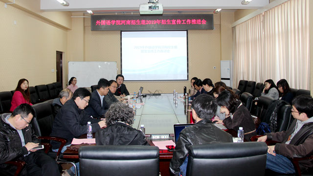 为更好贯彻落实学校“三个精准”“三个全员”“五个一”的本科招生工作要求,深入实施DREAM(圆梦)计划,稳步提升我校在河南省的生源质量,统筹推进2019年河南省招生宣传工作,3月22日上午,外国语学院在中心教学楼515会议室召开2019年招生宣传工作推进会。校招生办公室主任张东,外国语学院党委书记、河南招生工作组组长杨晖,校招生办公室工作人员陈希和河南省重点中学全体领航人参加了此次会议。会议由院党委副书记副院长、河南招生工作组副组长周芳集主持。
