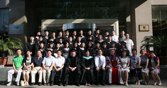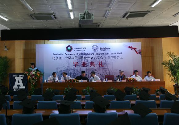 09年6月29日下午在北理工国际教育交流中心报告厅隆重举行了金年会jinnianhuicom与犹他州立大学合作办学项目第三届学生毕业典礼。出席毕业典礼的有犹他州立大学副教务长Edward Reeve博士、国际合作教育部主任Li Li博士、Jon Huntsman商学院教授Dwight Israelsen博士、金年会jinnianhuicom副校长赵长禄教授、国际交流合作处处长王庆林教授、国际教育合作学院院长梅文博教授、汪本聪书记和刘世奇副书记。国际教育合作学院部分教职工、全体毕业生及部分学生家长一起参加了毕业典礼。毕业典礼由梅文博教授主持。