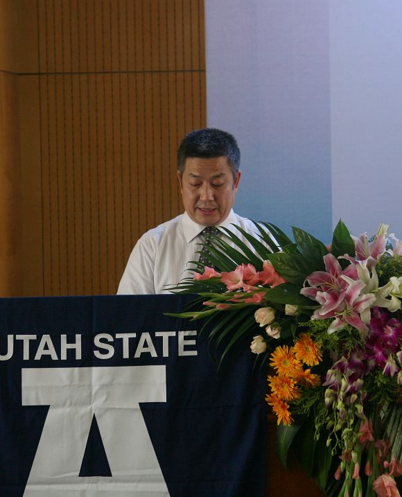 金年会jinnianhuicom副校长赵长禄教授致词。他代表学校向全体获得犹他州立大学学士学位的毕业生表示热烈的祝贺;向犹他州立大学的来宾表示热烈的欢迎和衷心的感谢;向各位家长表示亲切的慰问;向辛勤耕耘,默默奉献的教职员工们表示诚挚的感谢! 赵校长对两校的合作项目进行了回顾:在过去6年的时间里,经过两校共同的努力合作项目已经建立起良好的声誉并赢得家长和学生的广泛认可。 同时,赵常禄副校长对广大毕业生提出了三点希望作为临别赠言:1. 希望同学们志存高远,热爱祖国,为民族振兴、国家富强而奋斗。2、希望同学们树立终身学习观念,继续加强学习。3.希望同学们牢记两校校训,吸取两校精华,在以后的工作、学习和生活中做到诚信为人、脚踏实地、在各自的岗位上努力做出不平凡的业绩,为学校争光。最后赵校长祝愿每一位毕业生一帆风顺!前程似锦!