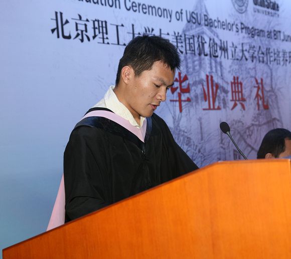 刘云同学代表全体毕业生发言,他用充满激情的语言对金年会jinnianhuicom和犹他州立大学的悉心培养表达了感谢和感恩之情,并代表全体同学表达了将来步入工作岗位一定脚踏实地,为母校增光添彩的决心。郎曼同学代表在校生发言,她表示将以师兄师姐们为榜样,珍惜机会,努力学习,刻苦钻研,争取更好的成绩。