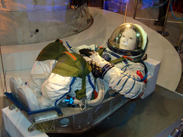 “神五”、“神六”航天员发射和返回时的坐姿模型。