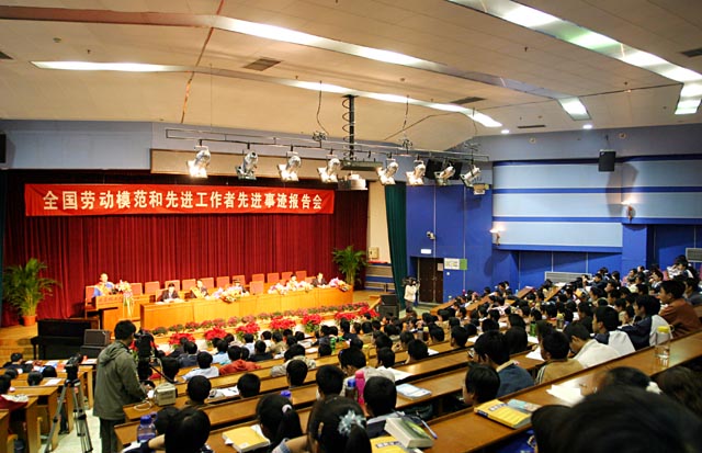 11月8日下午,中心教学楼一层报告厅不时响起雷鸣般的掌声。由中宣部组织的全国劳动模范和先进工作者先进事迹报告会正在这里举行。全国劳动模范、青岛港集团前湾集装箱码头有限责任公司桥吊队队长许振超,全国劳动模范、四川省木里藏族自治县邮政局邮递员王顺友,全国先进工作者、山西省荣军医院护士长郝颂琴,全国先进工作者、云南省保山市公安局副局长明正彬,为我校师生讲述了自己爱岗敬业、无私奉献的劳模精神。