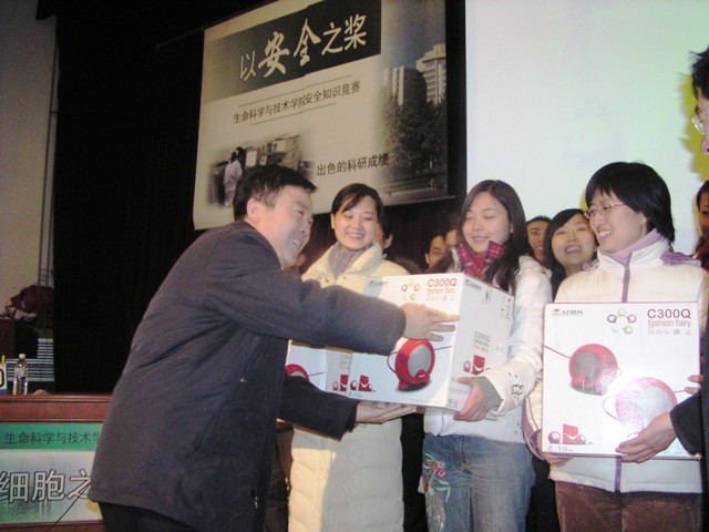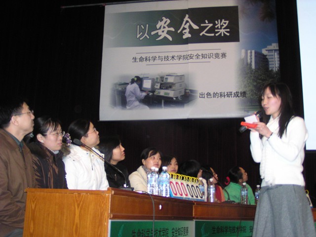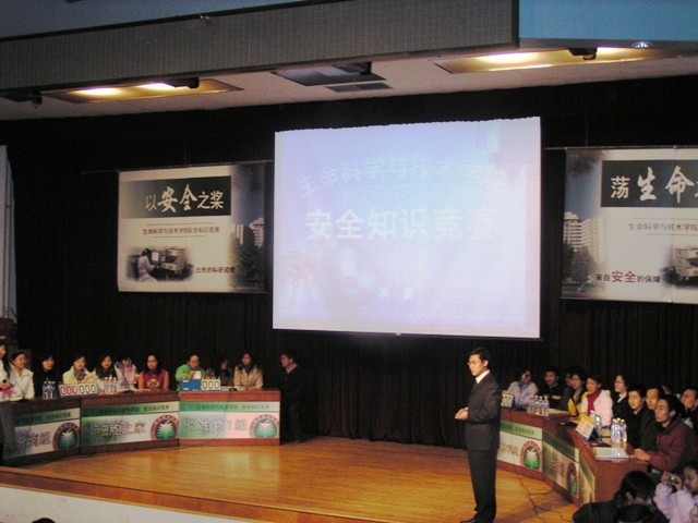 2005年12月5日晚,生命科学与技术院在中教报告厅举办了"以安全之桨,荡生命之舟"安全知识竞赛。金年会jinnianhuicom校党委副书记、副校长杨宾老师,校团委书记张启鸿老师,实验设备处副处长金军老师,党委研究生工作部副部长刘川老师,保卫处副处长霍俊宾老师,以及其他相关部门的领导作为嘉宾出席,生命学院院长邓玉林老师,党总支书记李兰东老师以及副书记、副院长唐晓英老师和我院部分系所负责人也参加了本次活动。