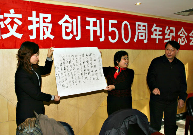常务副校长李志祥,党委副书记、副校长杨宾,党委副书记侯光明拨冗莅临,与新老报人一起交流感情,展望未来。70余人欢聚一堂,共庆我校校报50华诞。中国高校校报协会副理事长、北京大学校报主编魏国英老师,北京高校校报研究会理事长、北京林业大学党委宣传部部长、校报主编铁铮老师,曾经在校报工作过的杨子真、曹青阳等老同志也应邀出席了纪念会。出席纪念会的还有学校党办、校办、组织部、团委以及各学院相关领导、宣传干事、通讯员等70余人,大家欢聚一堂,共庆我校校报50华诞。