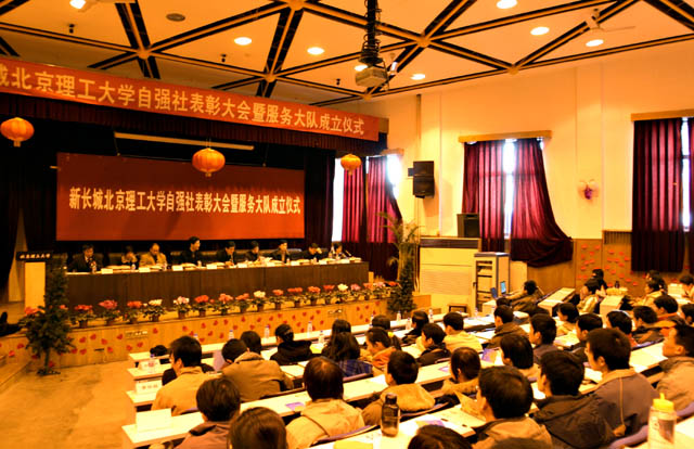 12月23日下午,我校在七号楼一层报告厅隆重举行自强社2005年表彰大会暨服务大队成立仪式。副校长赵显利,校团委书记张启鸿,学生工作处处长刘明奇、副处长娄秀红、张振华,新长城项目部主任助理陈红涛,项目主管颜志涛和各学院资助工作负责老师参加了会议。