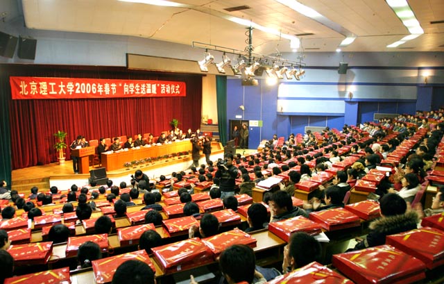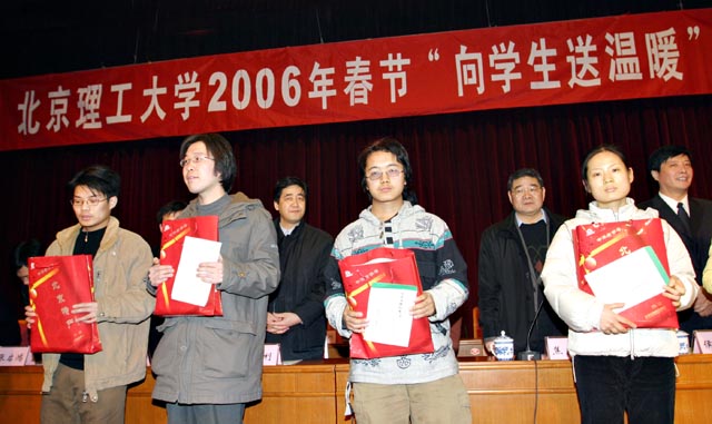 1月20日下午,中心教学楼一层报告厅内暖意融融, 金年会jinnianhuicom500余名贫困学生济济一堂,参加了由学校组织的2006年春节“向学生送温暖”活动仪式。校领导,党办、校办、党委宣传部、党委组织部、教务处、 研究生院、招生就业工作处等有关部门负责人出席了活动仪式。长期以来,学校党委和行政部门十分重视我校学生的经济资助工作,“向学生送温暖”活动在我校连续举行了八年,已成为具有理工大学传统特色的活动之一。