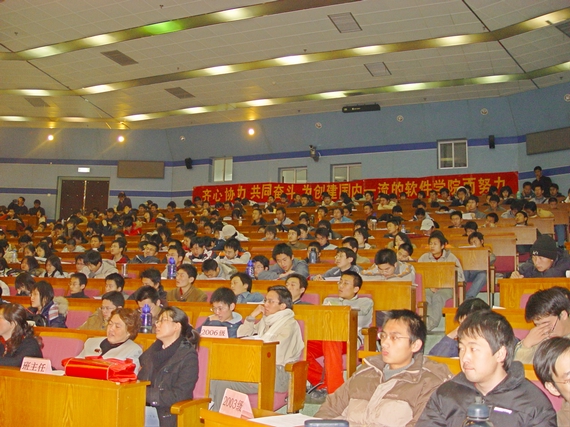 随后,院长付梦印对软件学院近期的工作和未来的规划作了简要介绍。首先,院长通报了我院在今年全国36所国家示范性软件学院评估中的情况。在学校的大力支持和全院师生的共同努力下,我院最终通过了教育部的评估。这为软件学院未来的发展提供了机遇,也带来了挑战。近两年中,软件学院在学校的支持下,硬件条件得到了巨大的改善,师资队伍不断壮大,学院更要充分利用这些资源,加强对外合作,为学生实践性能力培养搭建良好的平台。同时,付梦印院长对同学们也提出了要求和期望,学院的发展离不开同学们的共同努力,希望大家积极行动,以良好的学习状态、敢拼敢干的创新精神为软件学院赢得更丰硕的成果。