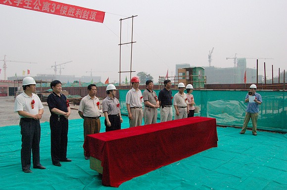 匡镜明校长一行首先参加了良乡校区学生宿舍楼群封顶仪式。