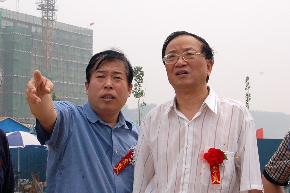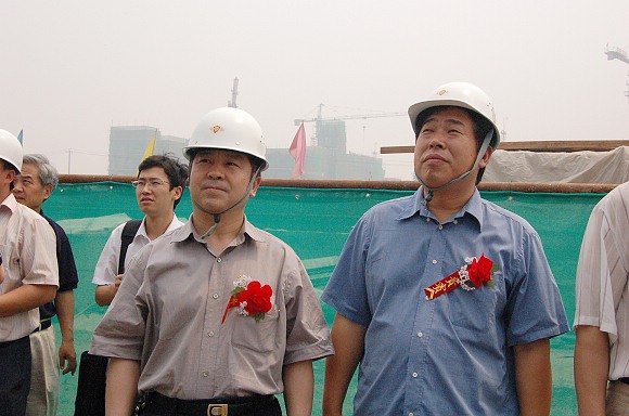 党委副书记、副校长杨宾和副校长李和章在观看学生宿舍楼群封顶过程。