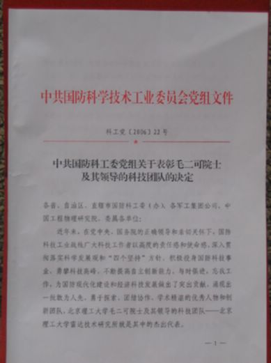 近日,中共国防科学技术工业委员会党组作出了《关于表彰毛二可院士及其领导的科技团队的决定》,对为国防科技事业做出突出贡献和显著成绩的毛二可院士及其领导的科技团队进行表彰,并授予该团队“国防科技工业优秀科技创新团队”称号。