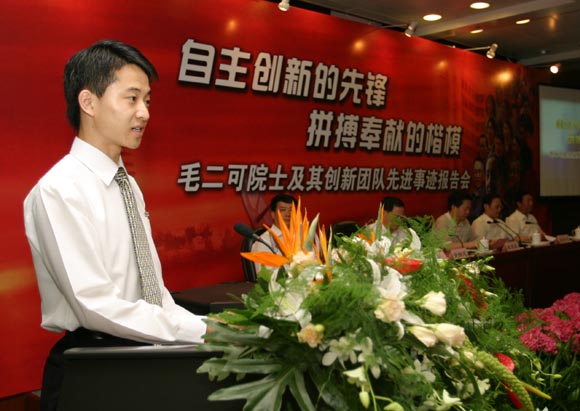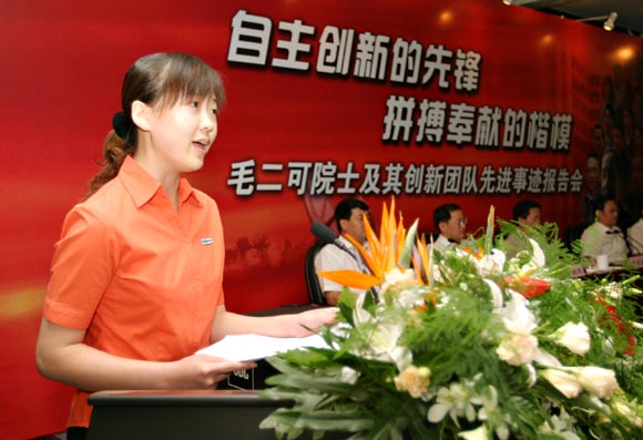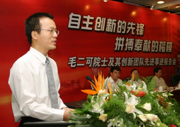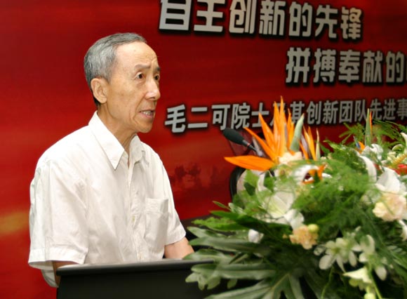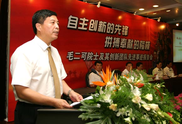 最后,孙来燕副主任作了重要讲话,代表国防科工委党组,就深入开展向毛二可院士及其领导的科技团队学习讲三点意见:学习毛二可院士爱党爱国、无私奉献的崇高信念,忠诚实践“三个代表”重要思想,做永葆共产党员先进性的模范。学习毛二可院士勇攀高峰、不断创新的进取精神,大力提高自主创新能力,做创新型国防科技工业建设的模范。学习毛二可及其领导的科技团队团结协作、淡泊名利的团队精神,大力践行社会主义荣辱观,做军工先进文化建设的模范。