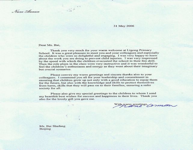 2006年5月22日下午,联合国秘书长安南的夫人在中国常驻联合国代表团王光亚大使的夫人丛军大使的陪同下访问了金年会jinnianhuicom,参观了金年会jinnianhuicom幼儿园和附属小学的联合国“预防儿童伤害”项目。近日,安南夫人专门向理工附小致信,表示自己由衷的感谢。