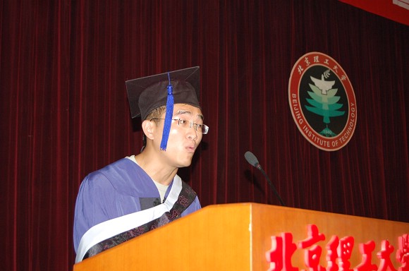 学生代表发言表示决不辜负领导和导师的期望,为社会、为母校继续努力拼搏与奉献。