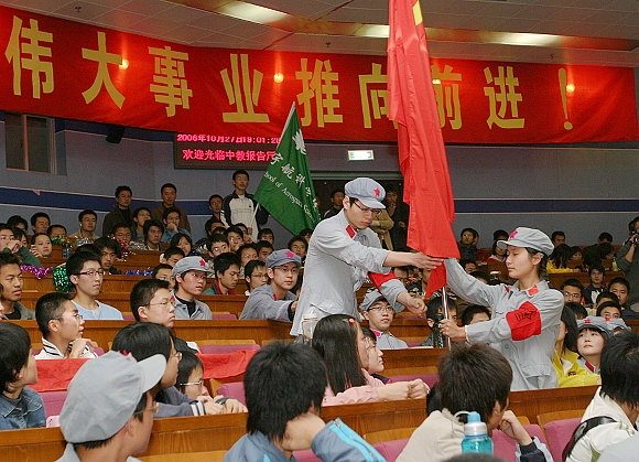 比赛现场,由44位身穿红军服的同学在观众席上摆出了红军长征路线图,一面象征长征队伍的红旗在这些“红军战士”手中一一传递,在传到一些重要地点和具有历史意义的时刻,“红军战士”为全场师生描述当时红军的情况,使师生重温了长征艰苦卓绝的历程。