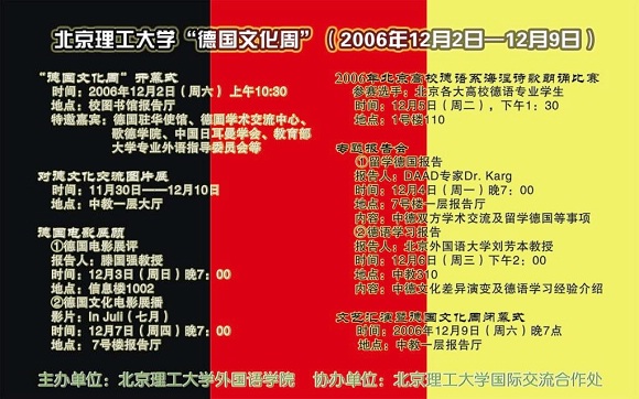 外国语学院德语系于2006年12月2日--9日举办“德国文化周”系列活动。此活动主要宗旨是宣传我校多年来对德交流成果以及德语专业教学成果,增强学生对德语学习的兴趣,加深学生对德国文化的认识和了解,扩展理工学生的视野,增强理工校园的人文气氛。