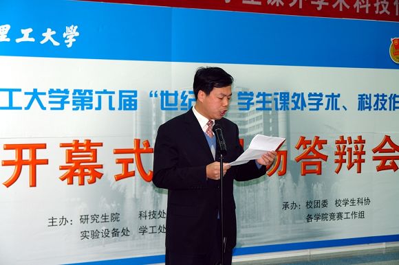 校党委副书记、副校长杨宾老师代表学校党政领导对第六届“世纪杯”学生课外学术、科技作品竞赛活动开幕表示热烈的祝贺,同时向参加本次活动评审的全体专家表示了衷心的感谢。杨宾副书记还指出学校历来对学生科技创新活动都给予了高度的重视和大力的支持,同时明确了我校学生科技创新活动早在上世纪50年代以毛二可院士为代表的学生便开始创办了学生组织并开展相关活动,具有优良的传统;从1989年开始的第一届全国“挑战杯”到去年的第九届全国“挑战杯”比赛,学校都积极组织参加比赛并取得了较好的成绩,我校“世纪杯”竞赛活动也是在上世纪80年代开始举办的,每两年一届,结合中央提出的全面提高大学生综合素质的决定和今年全国科技大会的胜利召开、我校科技大会的召开的良好契机,全校师生要努力营造良好的学术、科技氛围,为提高我校的学术、科技能力和水平积极努力、锐意进取,同时勉励广大同学积极参加学术科技活动。