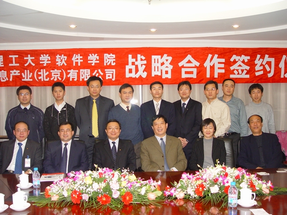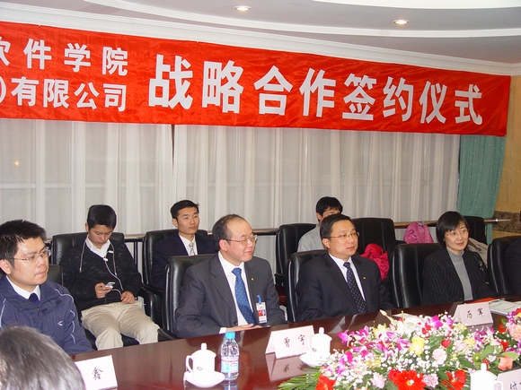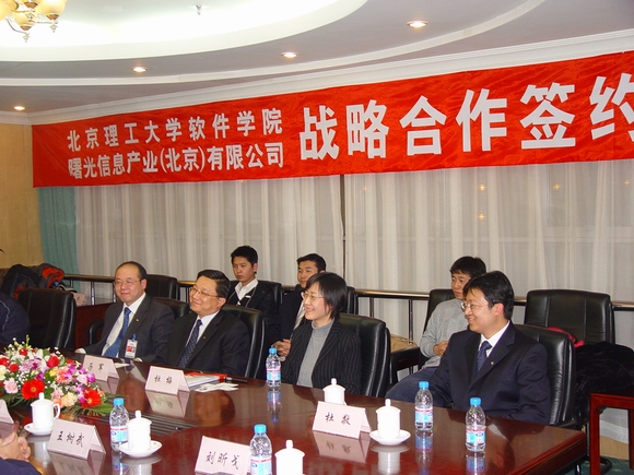 曙光公司总裁历军携包括人力资源总监杜梅、研发部经理曾宇等为代表在内的公司高管,与理工大学党委副书记侯光明,软件学院分党委书记王树武、院长付梦印、常务副院长丁刚毅、副书记副院长陈旵明、副院长陈硕鹰、对外合作办公室主任刘昕戈,共同出席了签约仪式。