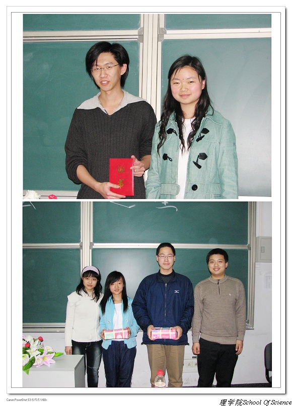 大家富有激情的演讲结束之后是最后一个令人激动的环节——颁奖,06级应用物理班由于成员平时参加活动比较积极,被评为志愿者模范班级;徐伯辰和任文璐两名同学获得了协会之星这个奖项;胡云翯等同学分别获得最具爱心奖,最具感染力奖,最佳口才奖和最佳建议奖;唐博等同学获得突出贡献奖;臧传云等同学获得最佳会员奖。通过这次活动,让大家更加深刻的体会到理学院青年志愿者协会“奉献、友爱、互助、进步”的志愿精神,领略到了这个团结奋进,服务人民的大家庭的风采。