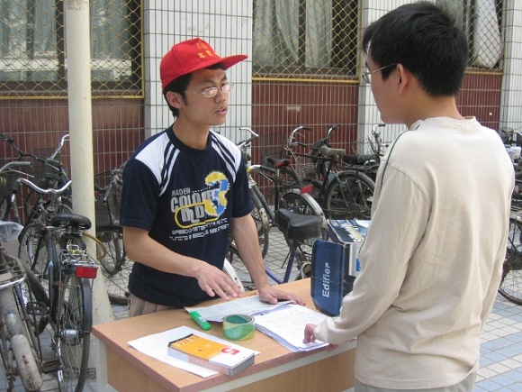 还没到一点就已经陆陆续续的有同学来到七号楼填表等待,我校同学的热情打动了在场每一位志愿者。一点整,血样采集就紧张的开展起来。随血车前来的除北京市血液中心的专业医生外,还有北京市志愿者之家的志愿者,作为生命学院青年志愿者协会的合作单位,他们与我院志愿者一道为前来捐献的同学们答疑解惑。在七号楼大厅,青协会员们详细指导前来捐献的志愿者填写信息表并为他们耐心解答填表中遇到的各种问题。