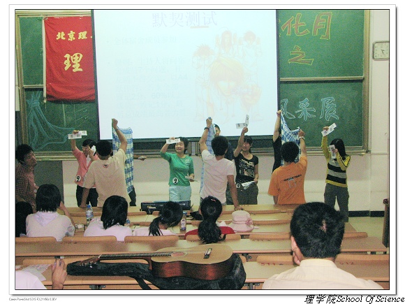 2007年5月19日下午,理学院首届“宿舍风采展”在二号楼106教室举行,拉开了今年理学院“主题活动月”的序幕。本次活动由理学院学生会文艺部和生活部主办,以宿舍为单位报名参加,得到了各个年级同学的大力支持。大家报名踊跃,最终通过一轮预赛后共选出了八个宿舍在当天的活动中展示自己宿舍的风采。理学院学生会的主席团成员和各位部长们出席了当天的活动。