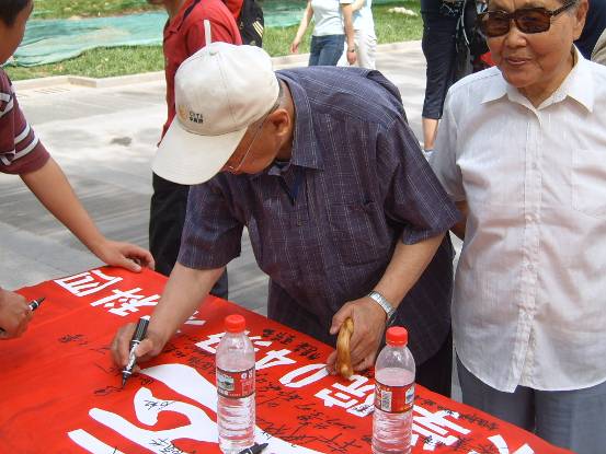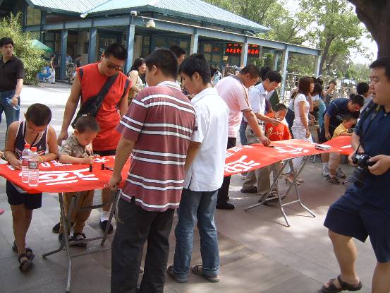 紫竹院公园里,我们的活动也在如火如荼地进行着。游人们积极地参与到我们的活动中,一位老大爷颤颤巍巍地拿起笔签下了自己的名字,并不时地点头说:“这活动好啊,好啊……”